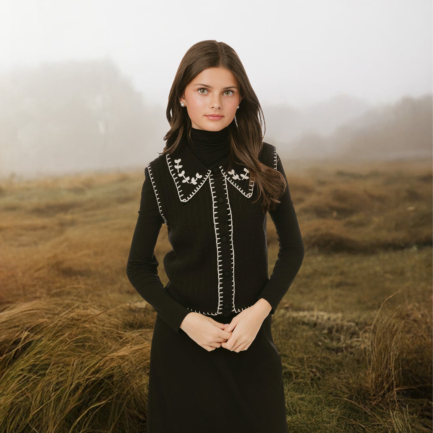 Black Mock Neck Knit Top With Multi Colored Flower Details